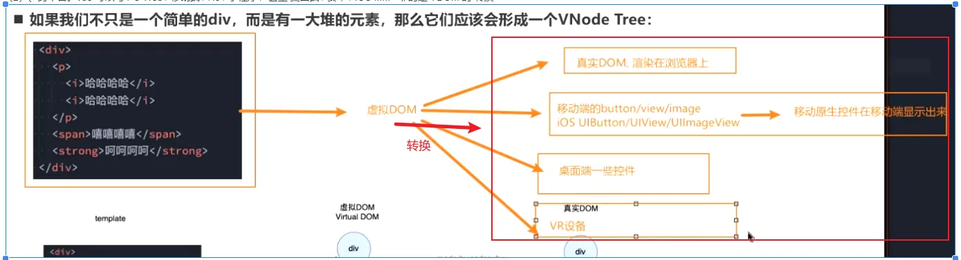 (2)、跨平台。vue 可以写 PC Web / 移动端 / H5 / 小程序 / 甚至 桌面端 / 安卓 / IOS … 靠的是 VDOM 的 转换