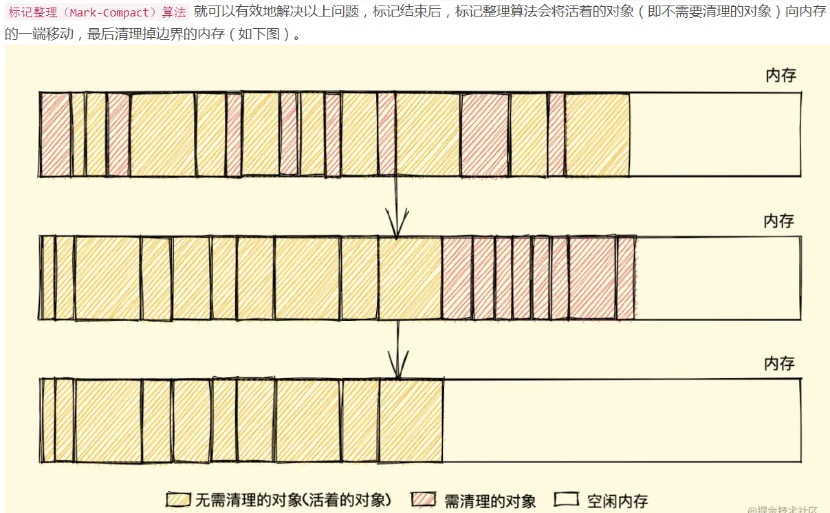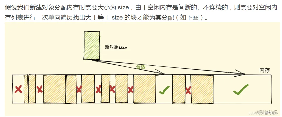 标记清除会导致内存空间分配不连续(内存碎片)、分配速度慢