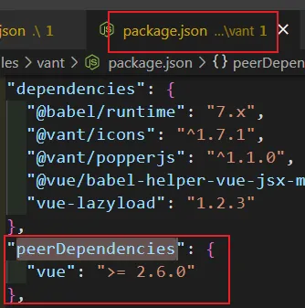 (3)、peerDependencies 解决核心库被下载多次,统一核心库的版本问题 (项目依赖了 vuex 和 vant 这两个子库,而这两个依赖又都同时依赖了 vue 这个框架。在字库中分别声明 peerDependencies 防止重复安装 vue)