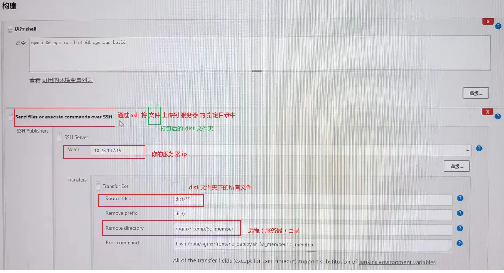 3、然后构建,配置构建命令,然后ssh到服务器指定的目录中