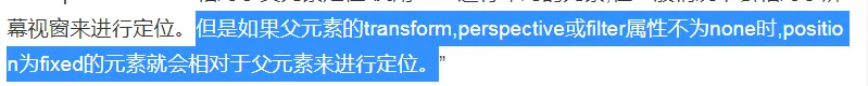 position: fixed; 一般都是相对于 屏幕视窗 (浏览器窗口) 来进行 定位 。(屏幕尺寸大小)