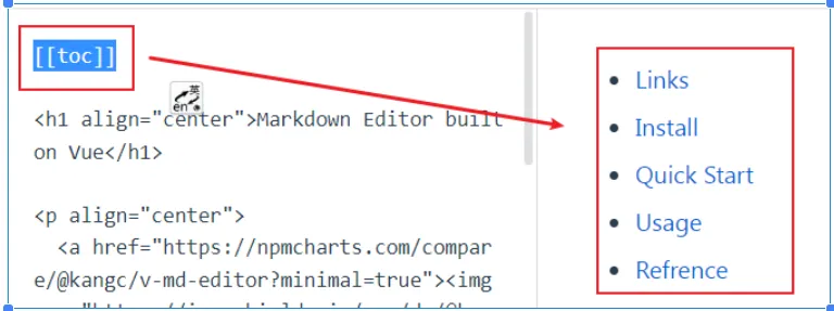 markdown 中写 [toc],即可生成 toc 到 markdown 的相应位置中